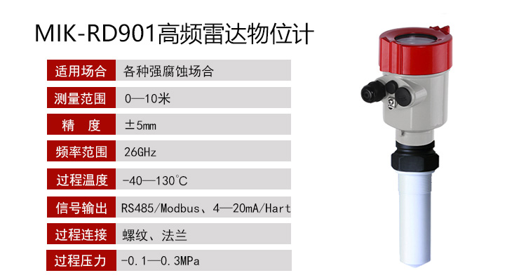 MIK-RD901雷達物位計天線發(fā)射極窄的微波脈沖,這個脈沖以光速在空間傳播,遇到被測介質(zhì)表面,其部分能量被反射回來,被同一天線接收。發(fā)射脈神與接收脈沖的時間間隔與天線到被測介質(zhì)表面的距離成正比。由于電磁波的傳播速度極高,發(fā)射脈神與接收脈神的時間間隔很小(納秒量級)很難確認,MIK—RD901高頻雷達物位計采用種特殊的解調(diào)技術(shù),可以準確識別發(fā)射脈神與接收脈神的時間間隔,從而進一步計算出天線到被測質(zhì)表面的距離。