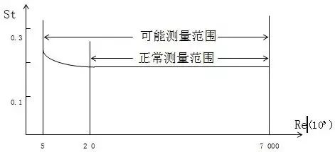 斯特羅哈數是一個無因次參數,下圖表示斯特羅哈數與雷諾數的關系,在一定的雷諾數范圍內,斯特羅哈數基本上保持不變,這樣就可以認為雷諾數在這個范圍內卡門漩渦的釋放頻率與流體的速度成正比。所以由檢測出來的頻率F就可求得流速V,并由V求得體積流量。