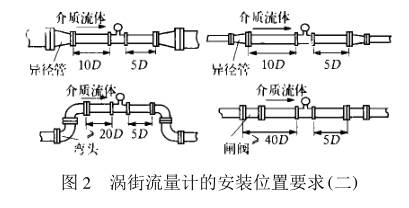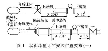 (1) 渦街流量計對前后直管段的一般要求是 : 前 20 D , 后 5 D( D 為相連工藝管道內徑) ,閥門一般設計在流量計的下游側。