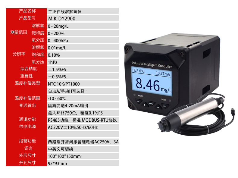 MIK-DY2900熒光法溶解氧儀是一款智能在線化學分析儀器,廣泛應用于火電、化工、化肥、冶金、環保、制藥、生化、食品和自來水等行業中的溶解氧、飽和度和溫度的連續監測。由于熒光法溶解氧儀采用熒光法測量溶解氧,測量時不會產生氧消耗,不存在干擾,不用極化,不光在復雜工況下有良好的表現,熒光帽設計壽命可達一年以上,大大降低了維護成本。