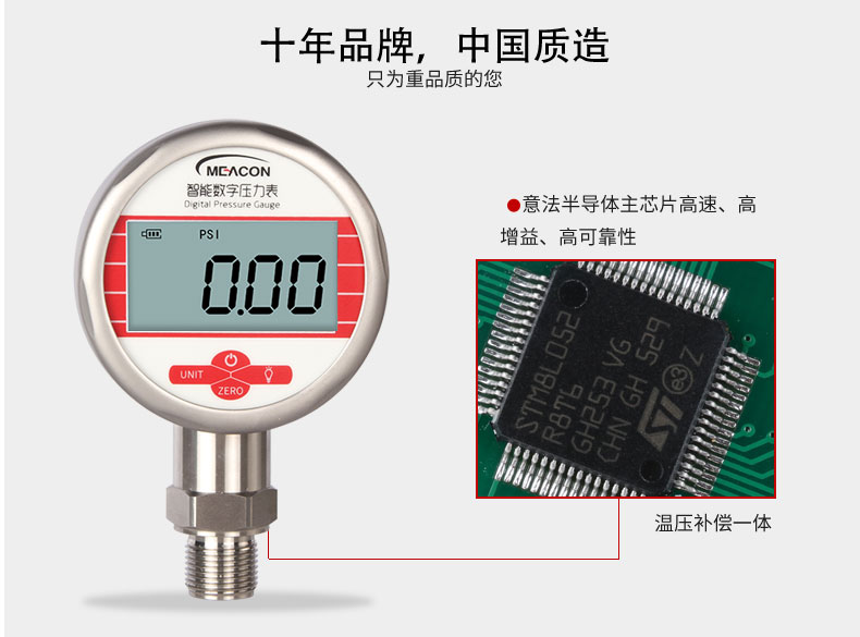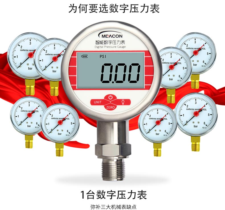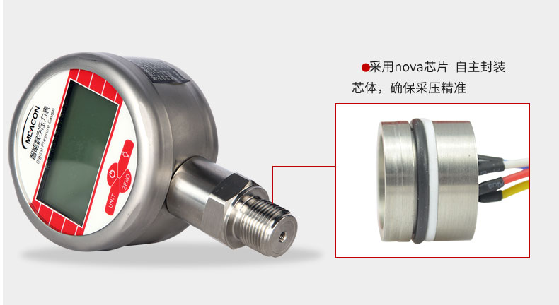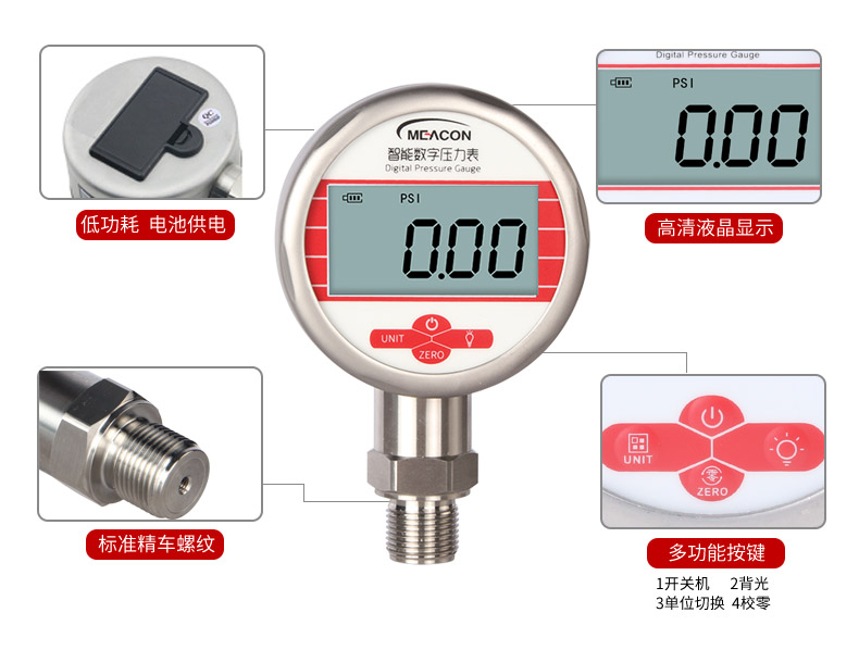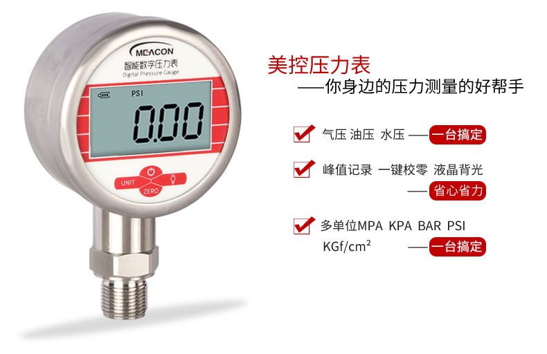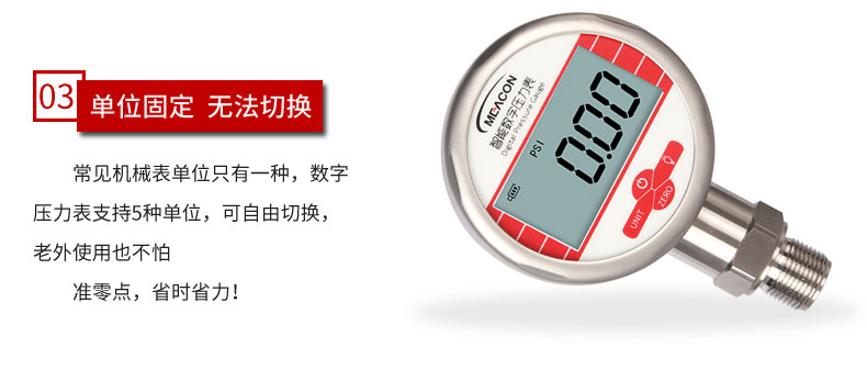 ? MIK-Y290數顯壓力表,內置高精度壓力傳感器,能夠準確實時顯示壓力,并且具有抗震動、顯示精度高、穩定性高、可清零等特點。該款智能壓力表采用LCD顯示屏,具有背光、單位切換等多種功能,操作簡單,安裝簡捷。由于采用低功耗的處理器芯片,續航時間長,該壓力表具有自動待機與一鍵清零功能,使用方便。該款智能數顯壓力表可以測量水、油、空氣等對不銹鋼無腐蝕的介質,適合壓力容器、自動化設備、實驗室設備配套的使用。