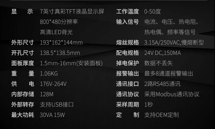 RX-6000F系列無紙記錄儀集各種工業場合中數據的測量、顯示、處理、運算、報警、記錄等多種功能為一體,具有36路模擬量信號輸入通道,8路繼電器報警輸出,150mA配電輸出(可接6路兩線制變送器,或者2路四線制變器),2路RS-485通訊接口,并擁有1個USB數據轉存接口。