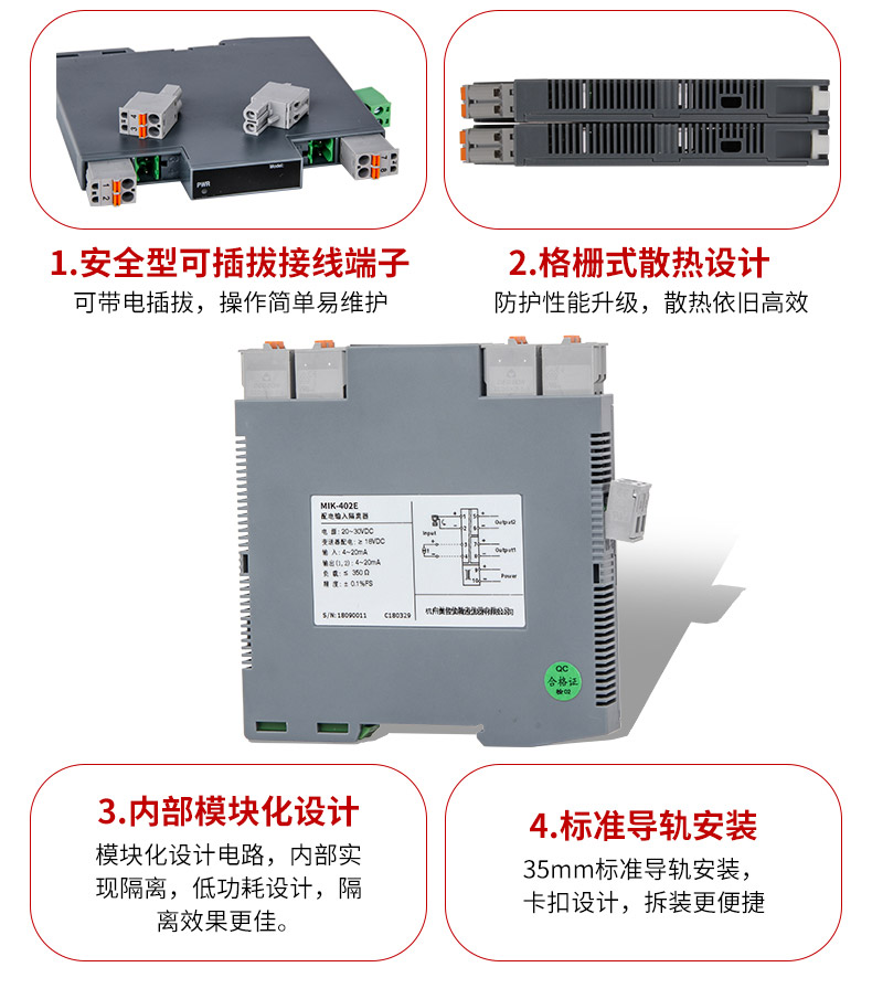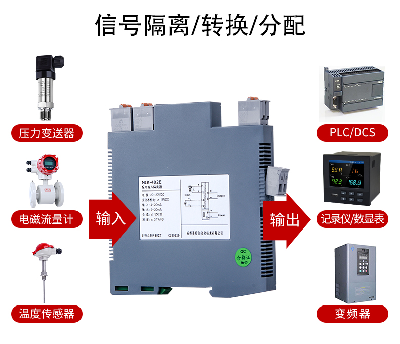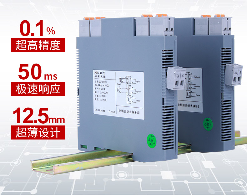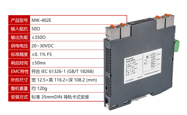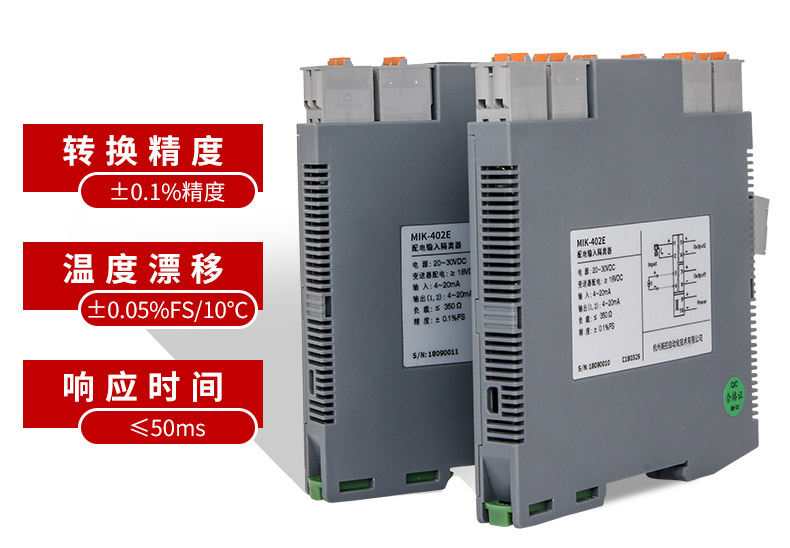 MIK-402E信號隔離器一進一出、一進二出、一進三出、一進四出、二進二出,且輸入、輸出磁隔離。并且大量運用于配電柜和隔離箱等各種工業場合。