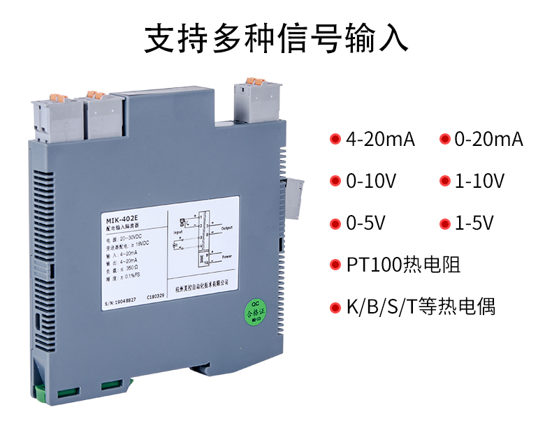 MIK-402E信號隔離器,輸入端、輸出端及電源端三端隔離,具有響應快、功耗低、溫度特性好等優點。電壓、電流隔離器將直流電壓或電流信號經過隔離傳送,轉換成所需的信號給其他儀表。可以與單元組合儀表及DCS、PLC等系統配套使用,給予現場儀表信號隔離、信號轉換、信號分配、信號處理等,從而提高工業生產過程自動控制系統的抗干擾性能力,保證系統的穩定性與可靠性。