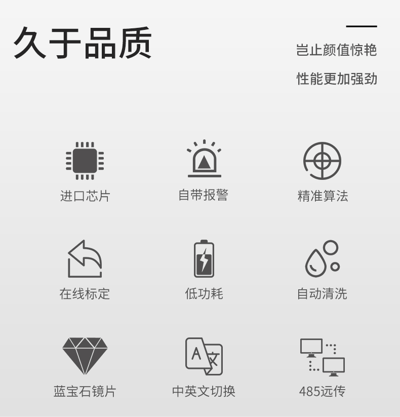 MIK-PTU300濁度在線分析儀是針對飲用水水質在線監測,量身研發的具有自主 知識產權的專利產品,具有超低濁度檢出限、高精度測量、設備長時間 免維護、省水工作和數字化輸出的特點,支持云平臺和手機移動端數據 遠程監控,以及 RS485-modbus 通訊,可廣泛應用于自來水出廠水、二次 供水、管網末梢水、直飲水、膜過濾水、游泳池、地表水等濁度在線監測。